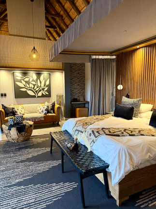 Tuningi is one of those lodges that instantly wraps you up in comfort with earthy tones, natural textures, and little nooks that make you want to curl up with a book and a gin simultaneously. The waterhole sits just to the left of camp, and the underground hide became our favourite spot within minutes. That afternoon we watched rhino and buffalo wander past the lodge towards the hide, and we quickly made our way along the path to watch them drink. At one point an elephant came right up to the water’s edge, so close that Nina and I could almost touch it. It was one of those breath-holding, heart-thumping bush moments you don’t forget. Such an unreal “welcome to Tuningi.” Even though we had opted to skip the afternoon game drive, it felt like the wildlife had come to us anyway, reminding us just how magical camp life can be.